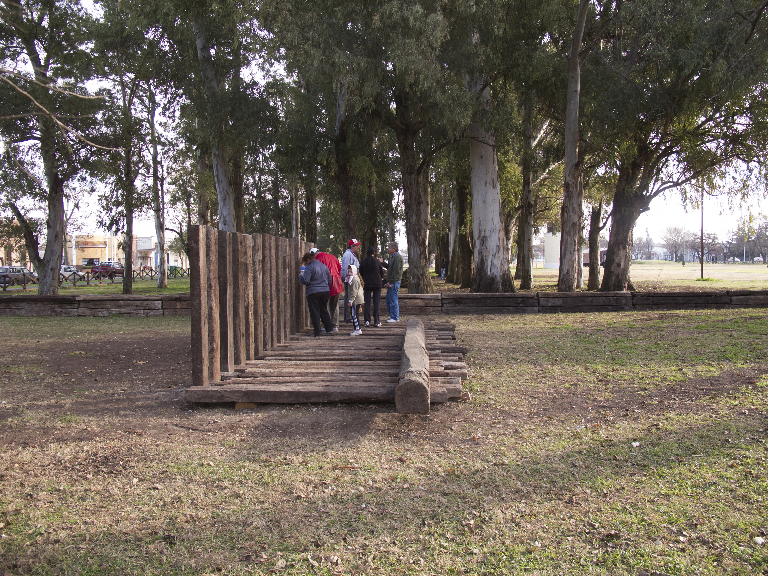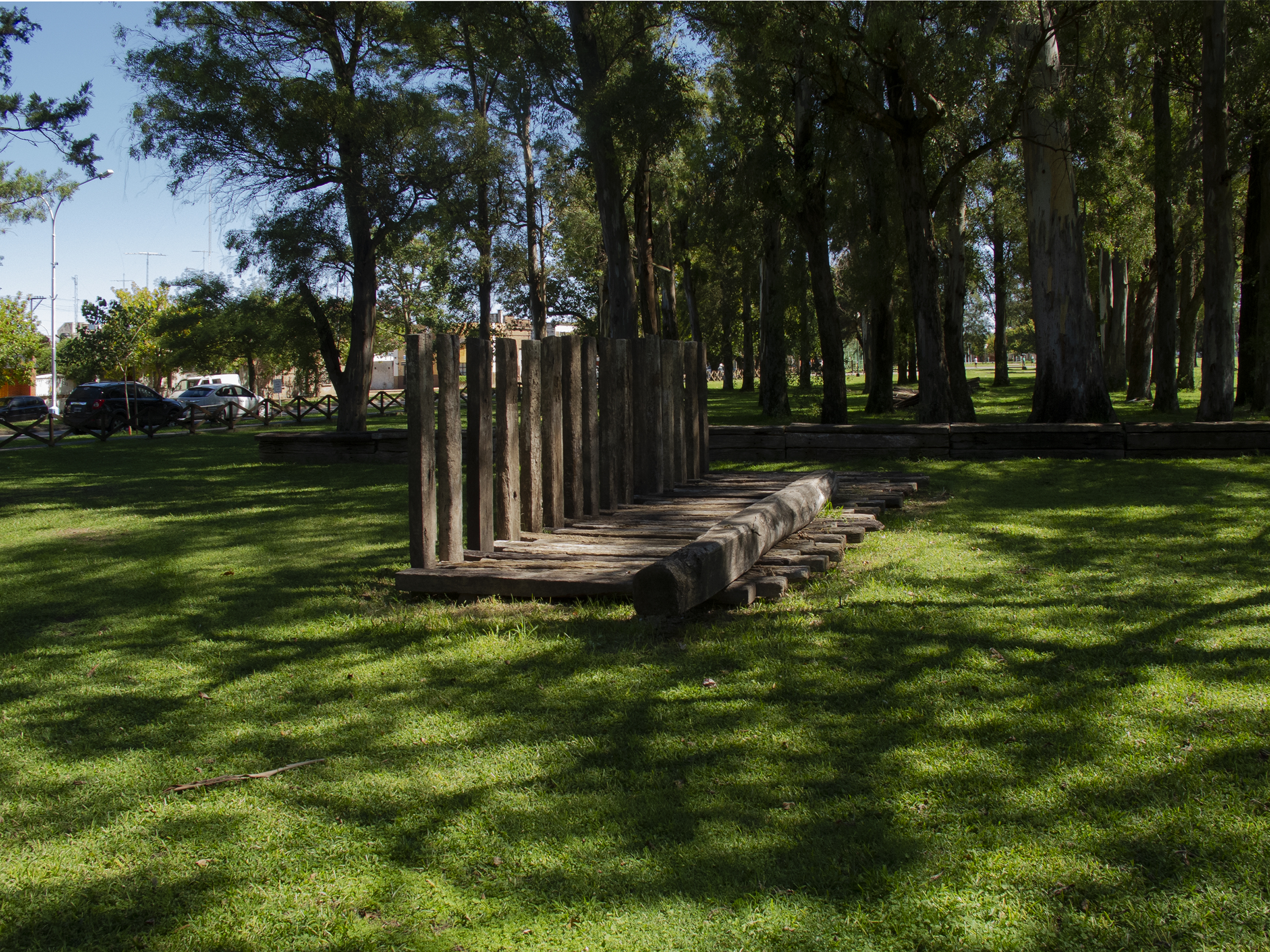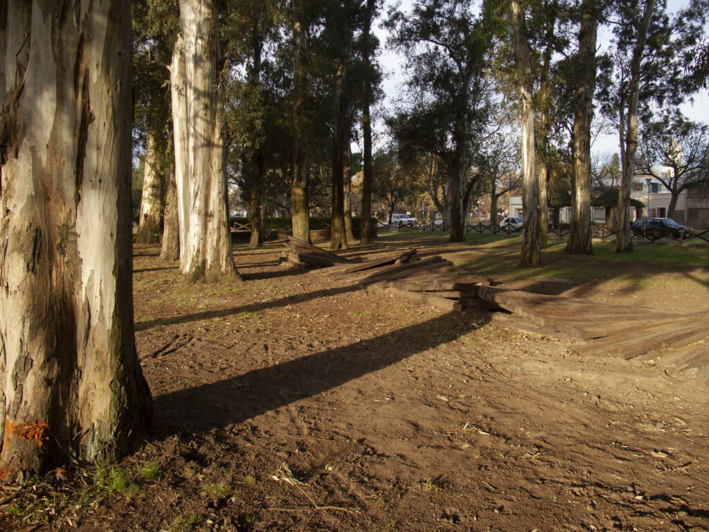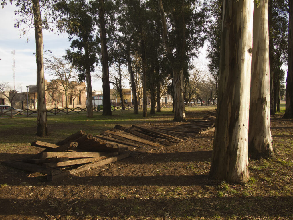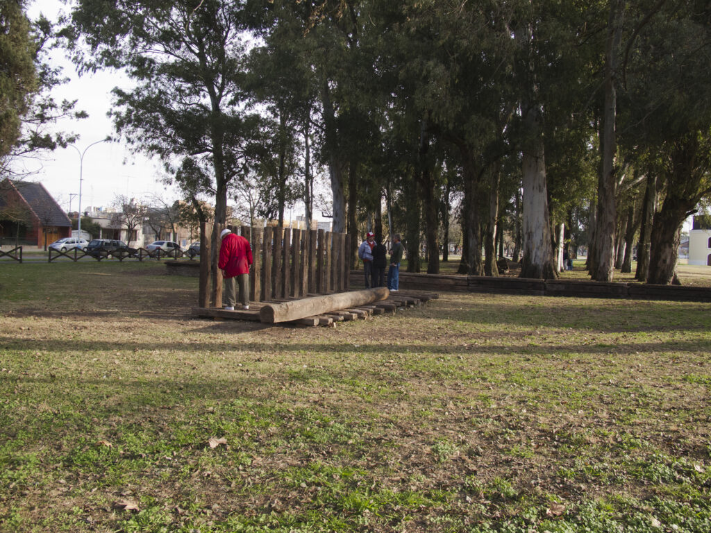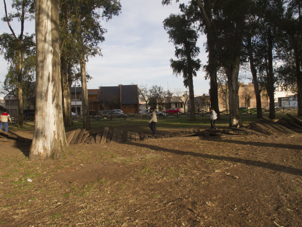 El proyecto transforma un sector de límites difusos del predio ferroviario en un espacio de esparcimiento, continuidad, memoria. Uno de estos fragmentos comienza a pocos metros de la ex estación de ferrocarril (hoy lugar del Ferro Club); el otro, es una plantación de eucaliptus característica de las estaciones de trenes. Ambos sitios se encontraban separados por un cerco. La intervención está compuesta por tres artefactos del paisaje construidos con durmientes de ferrocarril en desuso acopiados desde hace años dentro del predio, alineados sobre un eje paralelo a la avenida. El primero es una interpretación de quince poemas calados en placas de acero inoxidable del libro “Haikus de Guerra” escrito por Martín Raninqueo, músico y poeta, ex combatiente de Malvinas y bisnieto de caciques mapuches. El siguiente se articula sobre una estructura existente de hormigón de 30 metros de largo sobre la cual se sostenía un cerco que fue retirado. Y el último, conforma una superficie ondulada de 22 metros de largo por 2.70 metros de ancho dentro de la plantación de eucaliptus.
