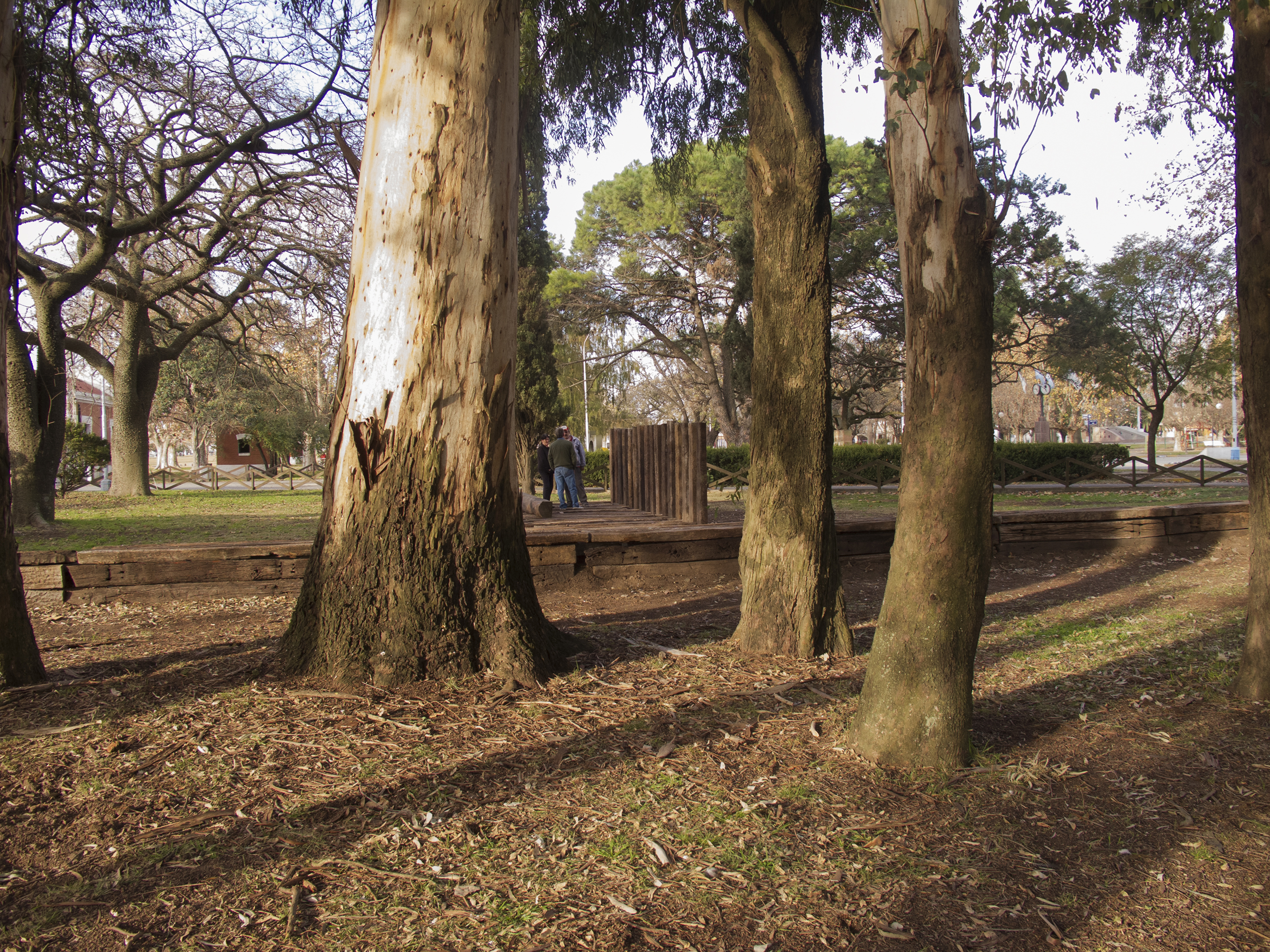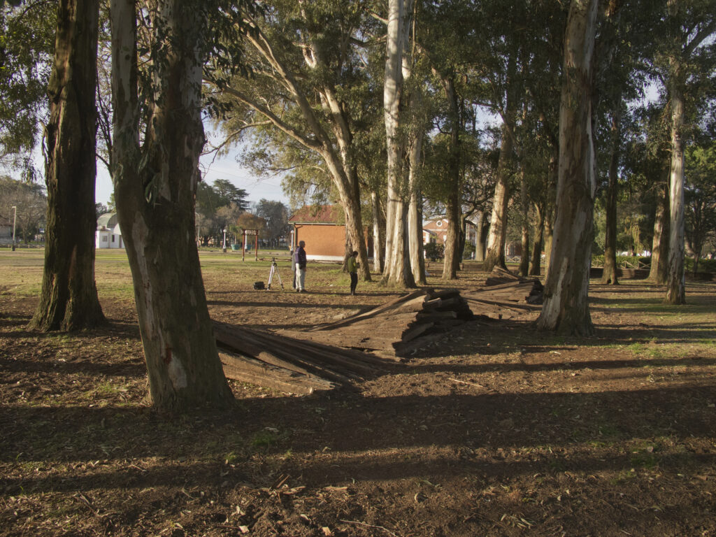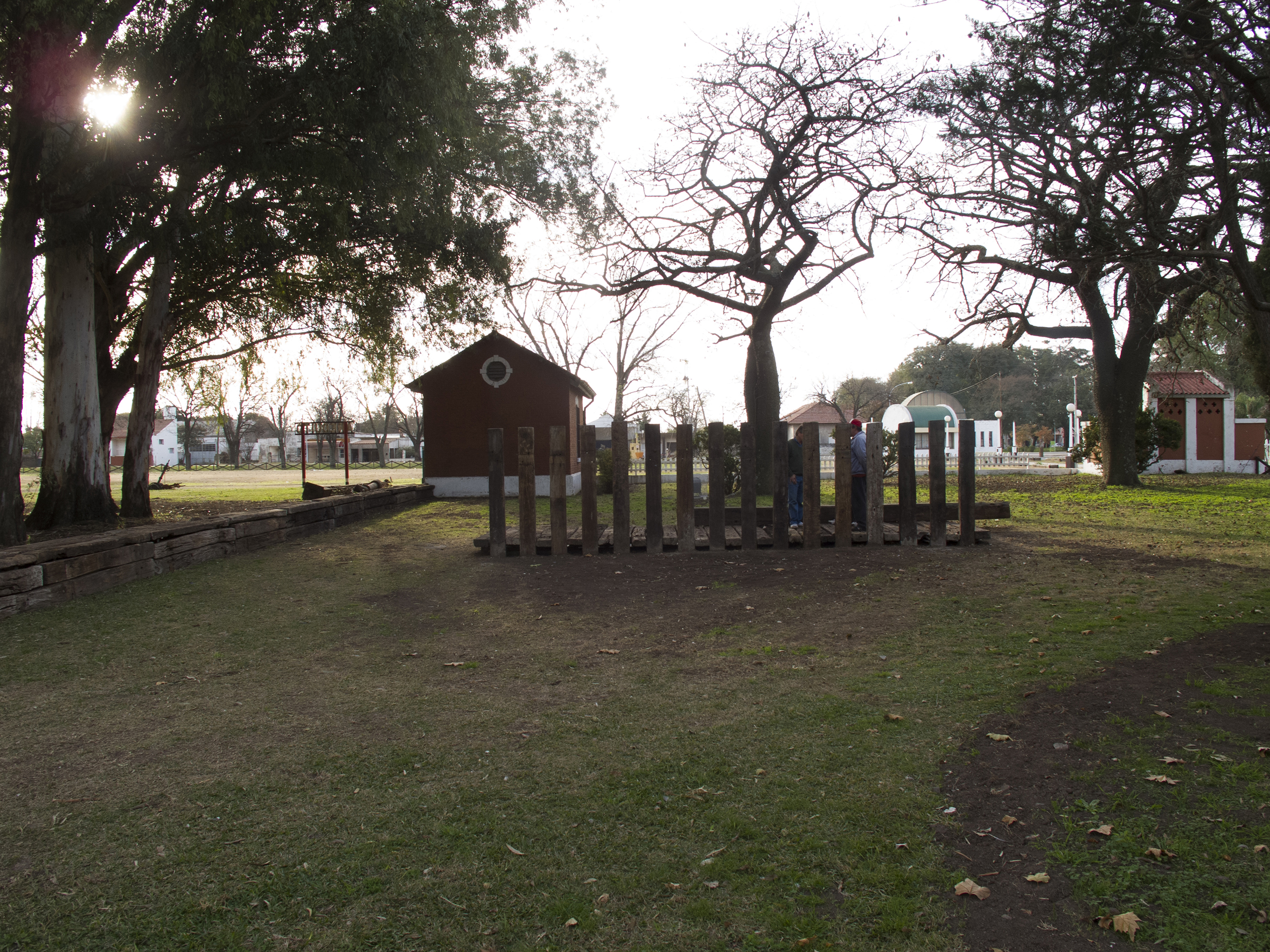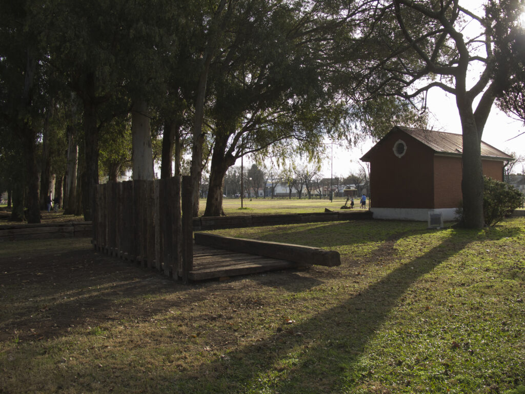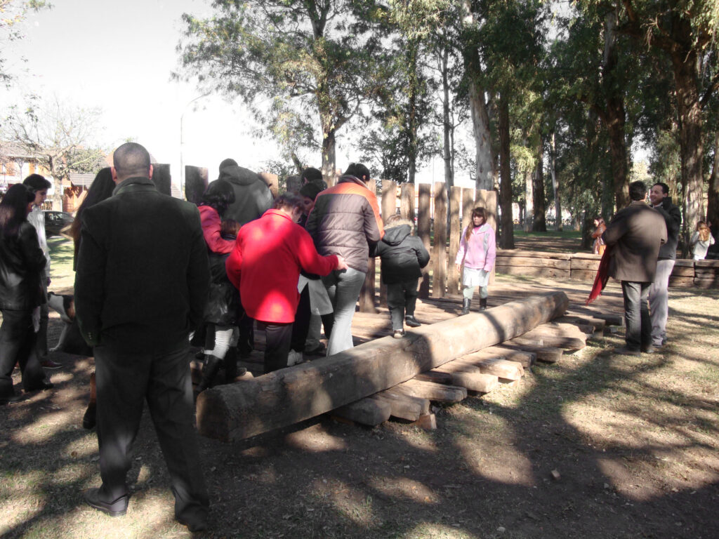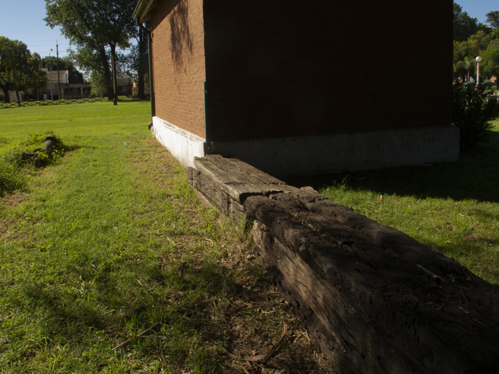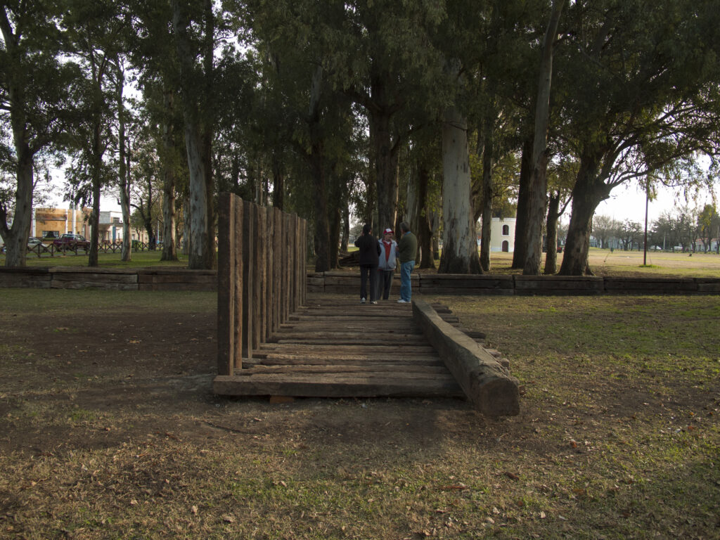 El proyecto transforma un sector de límites difusos del predio ferroviario en un espacio de esparcimiento, continuidad, memoria. Uno de estos fragmentos comienza a pocos metros de la ex estación de ferrocarril (hoy lugar del Ferro Club); el otro, es una plantación de eucaliptus característica de las estaciones de trenes. Ambos sitios se encontraban separados por un cerco. La intervención está compuesta por tres artefactos del paisaje construidos con durmientes de ferrocarril en desuso acopiados desde hace años dentro del predio, alineados sobre un eje paralelo a la avenida. El primero es una interpretación de quince poemas calados en placas de acero inoxidable del libro “Haikus de Guerra” escrito por Martín Raninqueo, músico y poeta, ex combatiente de Malvinas y bisnieto de caciques mapuches. El siguiente se articula sobre una estructura existente de hormigón de 30 metros de largo sobre la cual se sostenía un cerco que fue retirado. Y el último, conforma una superficie ondulada de 22 metros de largo por 2.70 metros de ancho dentro de la plantación de eucaliptus.