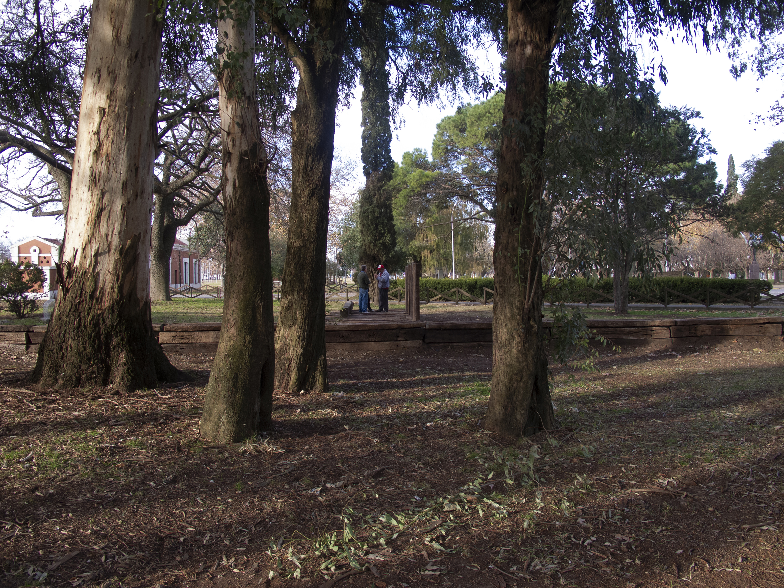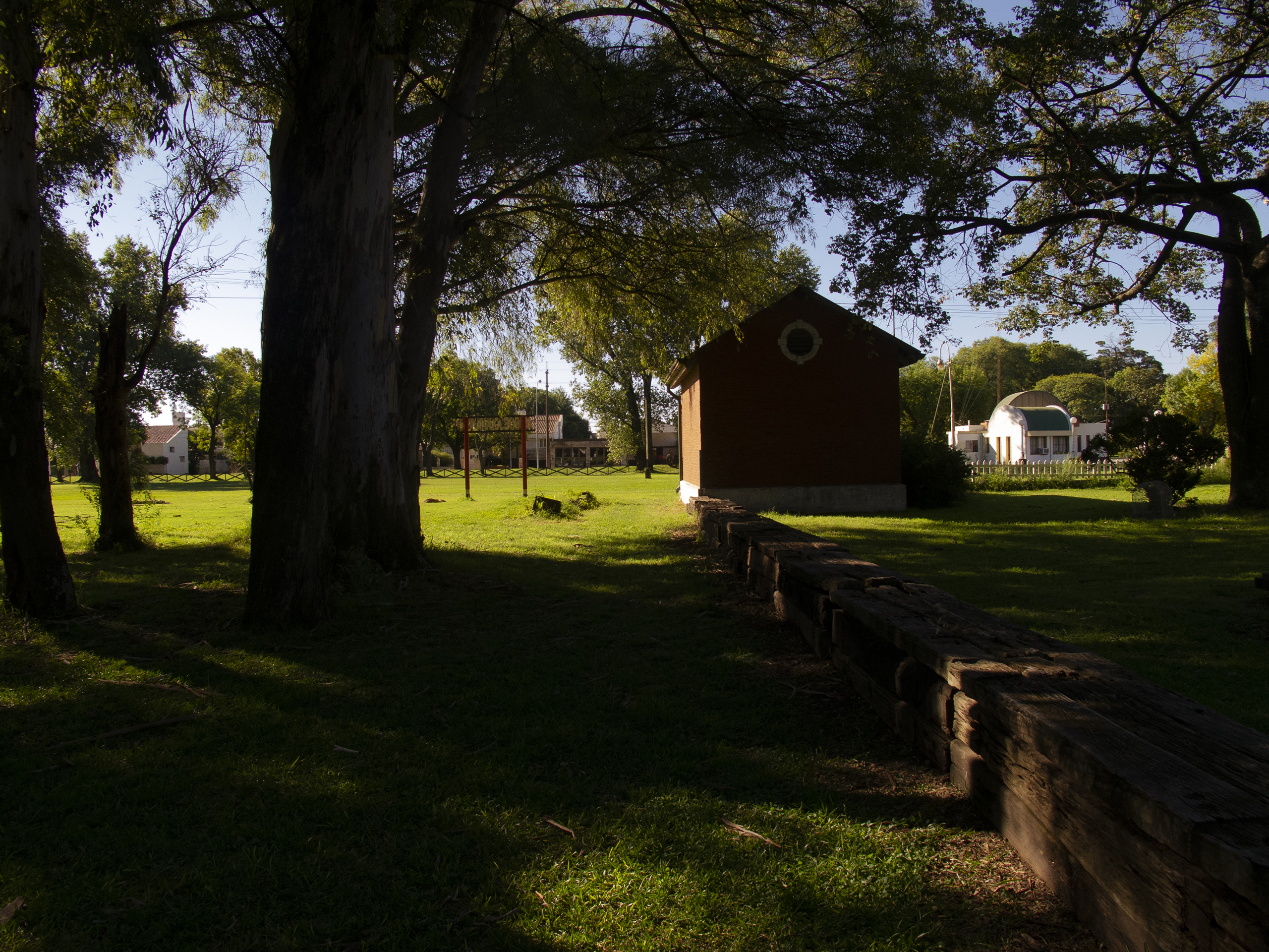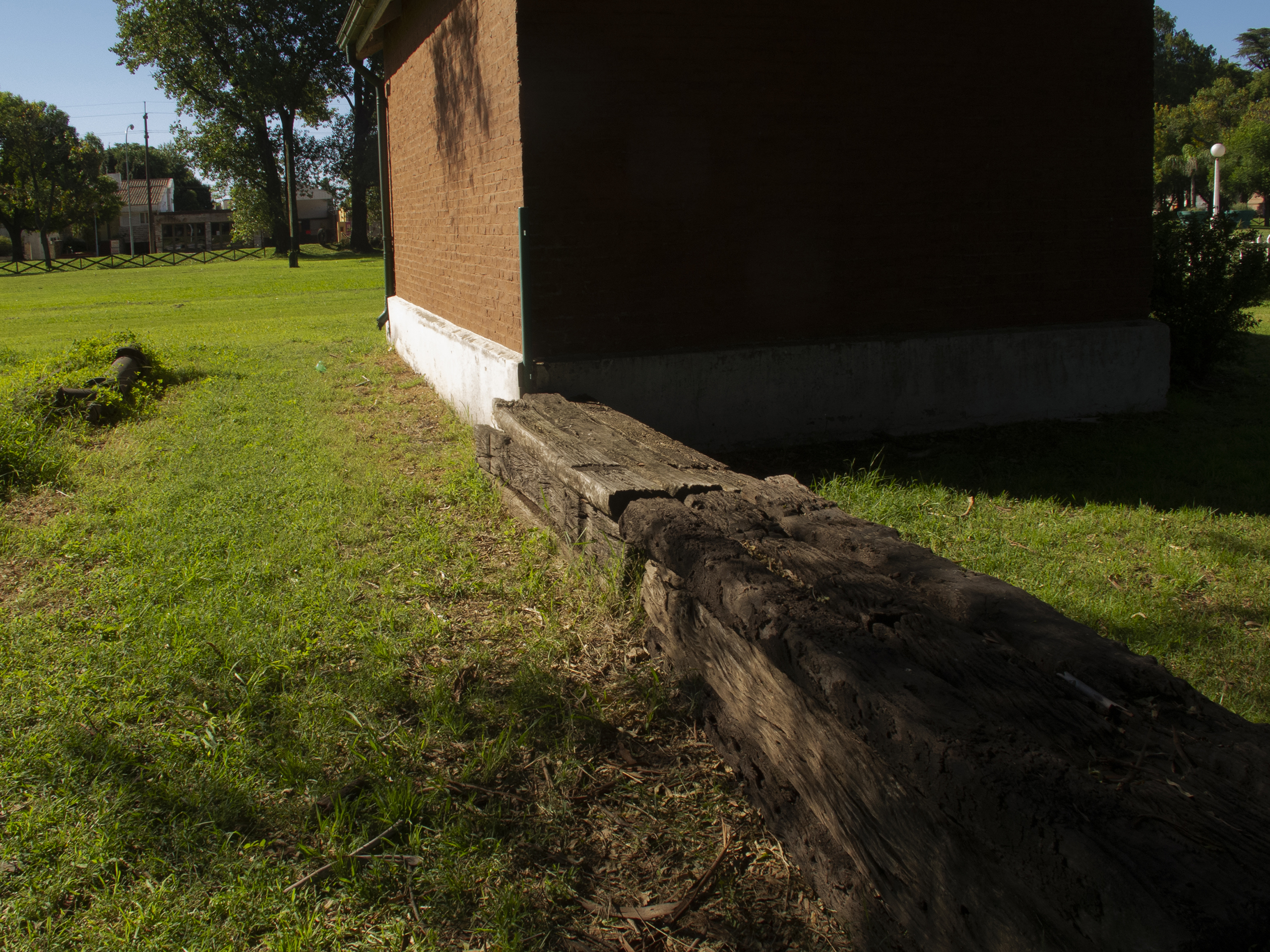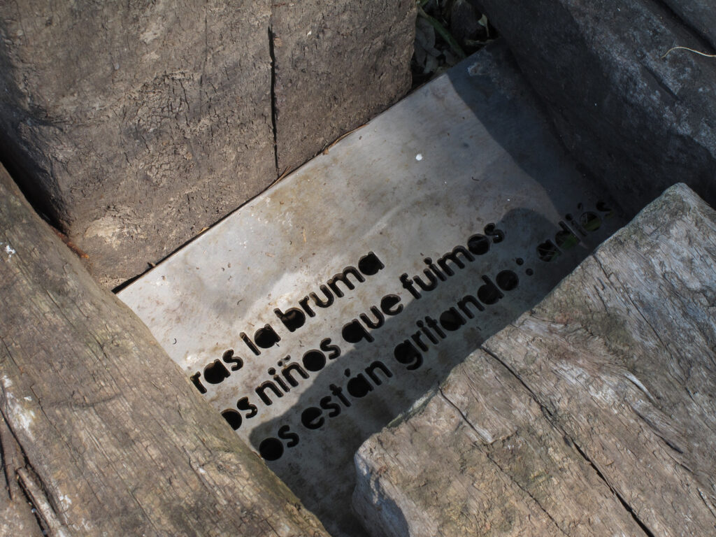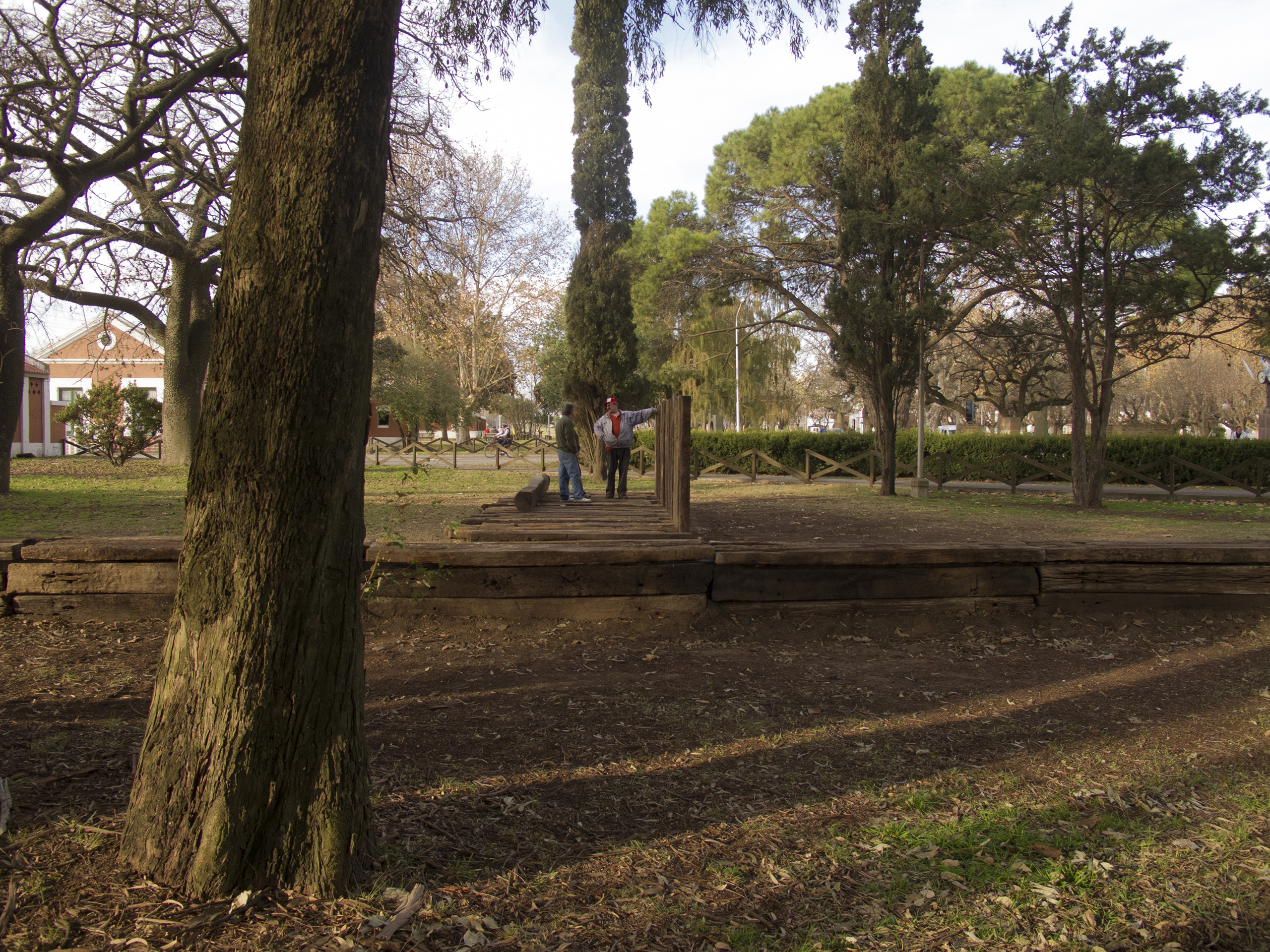 El proyecto transforma un sector de límites difusos del predio ferroviario en un espacio de esparcimiento, continuidad, memoria. Uno de estos fragmentos comienza a pocos metros de la ex estación de ferrocarril (hoy lugar del Ferro Club); el otro, es una plantación de eucaliptus característica de las estaciones de trenes. Ambos sitios se encontraban separados por un cerco. La intervención está compuesta por tres artefactos del paisaje construidos con durmientes de ferrocarril en desuso acopiados desde hace años dentro del predio, alineados sobre un eje paralelo a la avenida. El primero es una interpretación de quince poemas calados en placas de acero inoxidable del libro “Haikus de Guerra” escrito por Martín Raninqueo, músico y poeta, ex combatiente de Malvinas y bisnieto de caciques mapuches. El siguiente se articula sobre una estructura existente de hormigón de 30 metros de largo sobre la cual se sostenía un cerco que fue retirado. Y el último, conforma una superficie ondulada de 22 metros de largo por 2.70 metros de ancho dentro de la plantación de eucaliptus.