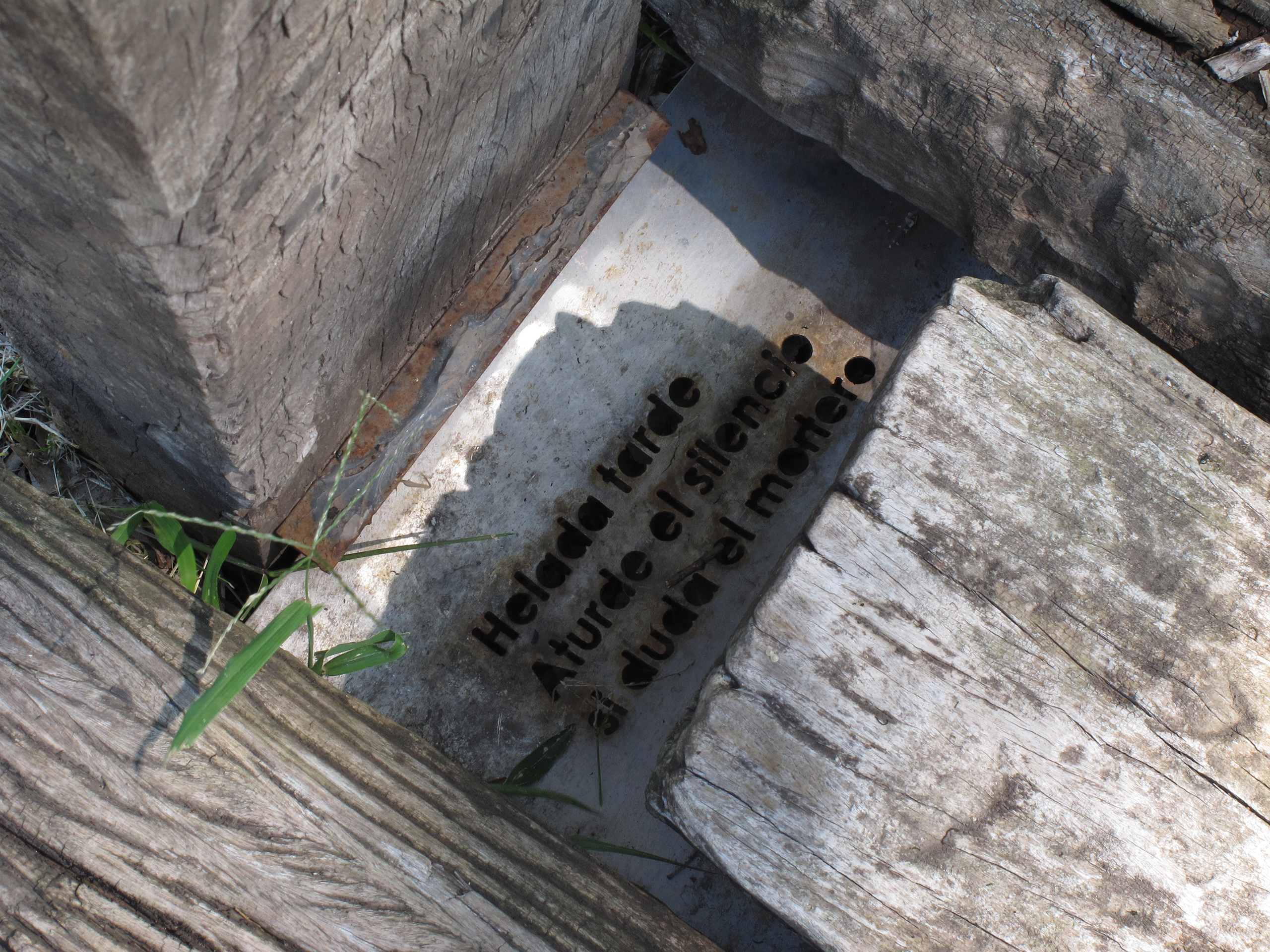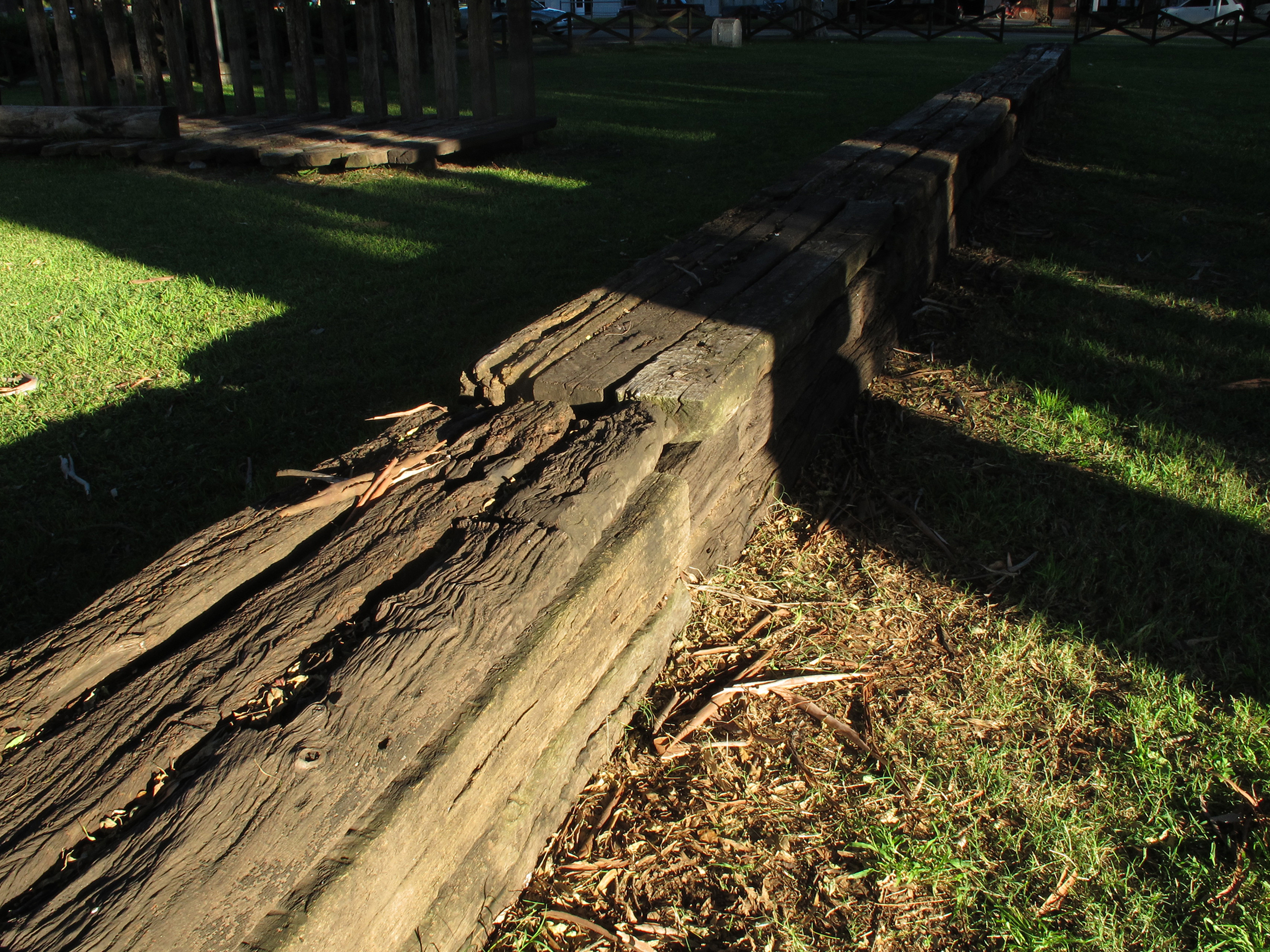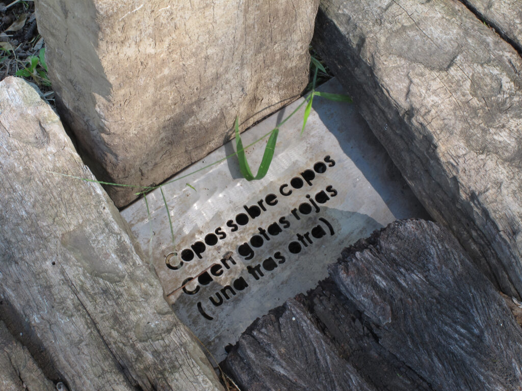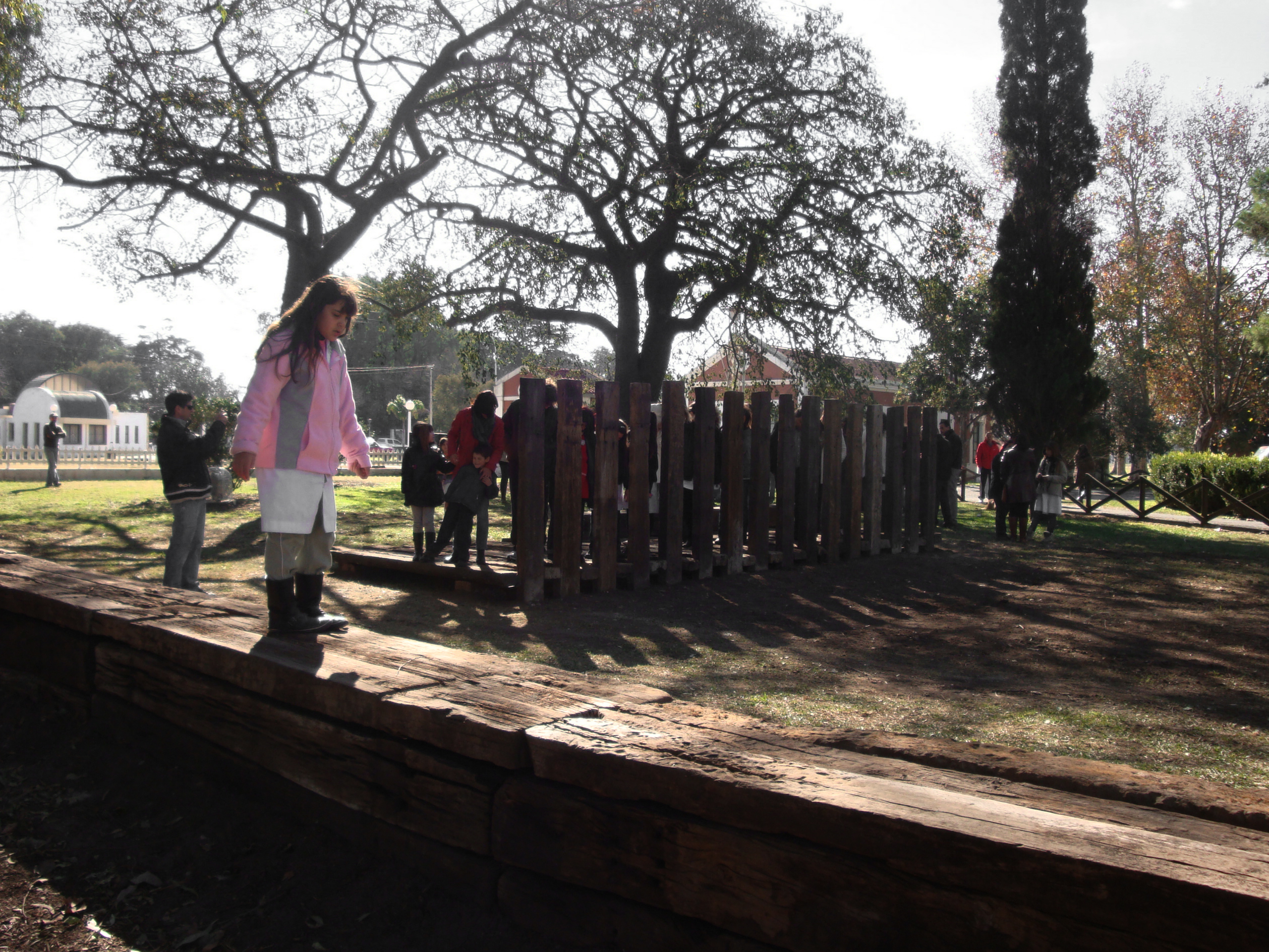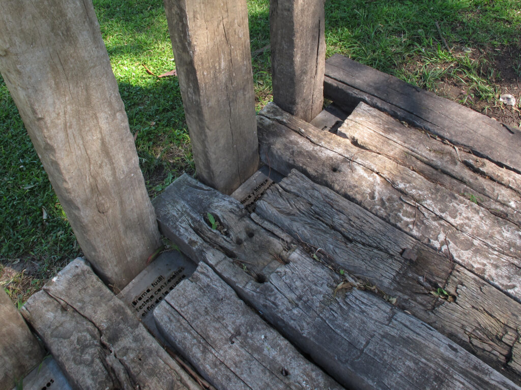 El proyecto transforma un sector de límites difusos del predio ferroviario en un espacio de esparcimiento, continuidad, memoria. Uno de estos fragmentos comienza a pocos metros de la ex estación de ferrocarril (hoy lugar del Ferro Club); el otro, es una plantación de eucaliptus característica de las estaciones de trenes. Ambos sitios se encontraban separados por un cerco. La intervención está compuesta por tres artefactos del paisaje construidos con durmientes de ferrocarril en desuso acopiados desde hace años dentro del predio, alineados sobre un eje paralelo a la avenida. El primero es una interpretación de quince poemas calados en placas de acero inoxidable del libro “Haikus de Guerra” escrito por Martín Raninqueo, músico y poeta, ex combatiente de Malvinas y bisnieto de caciques mapuches. El siguiente se articula sobre una estructura existente de hormigón de 30 metros de largo sobre la cual se sostenía un cerco que fue retirado. Y el último, conforma una superficie ondulada de 22 metros de largo por 2.70 metros de ancho dentro de la plantación de eucaliptus.