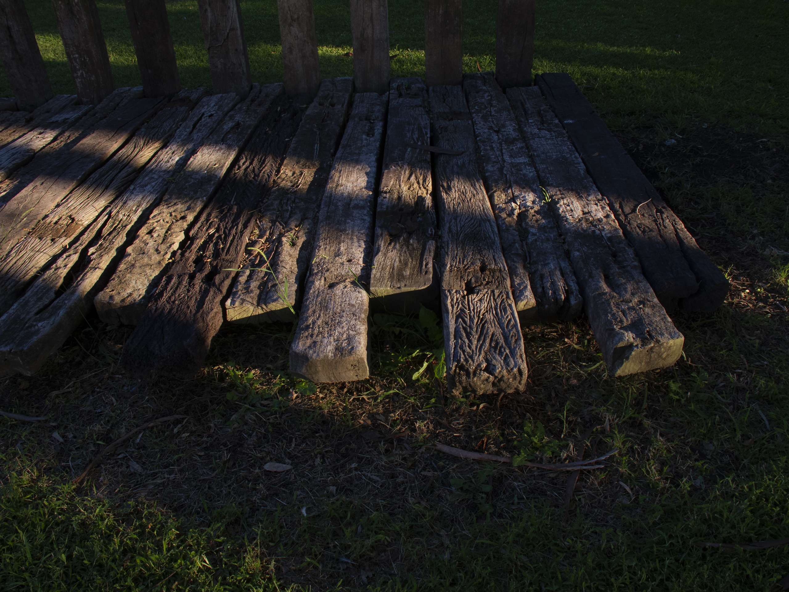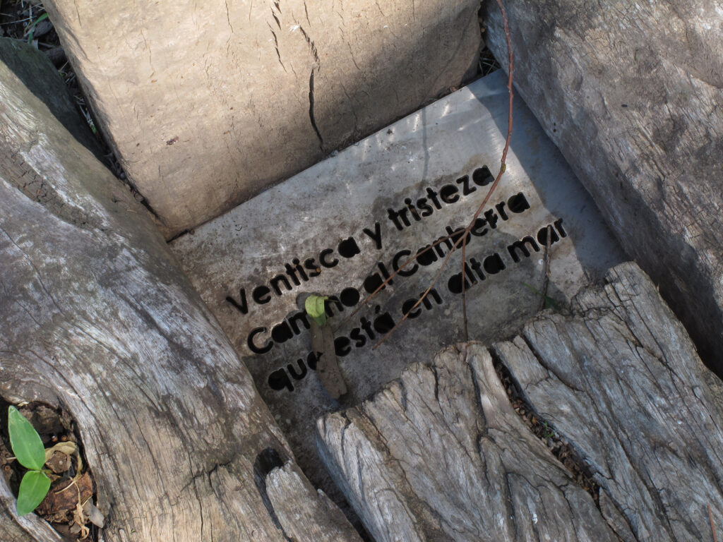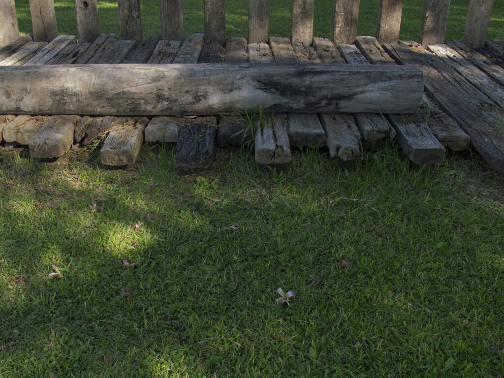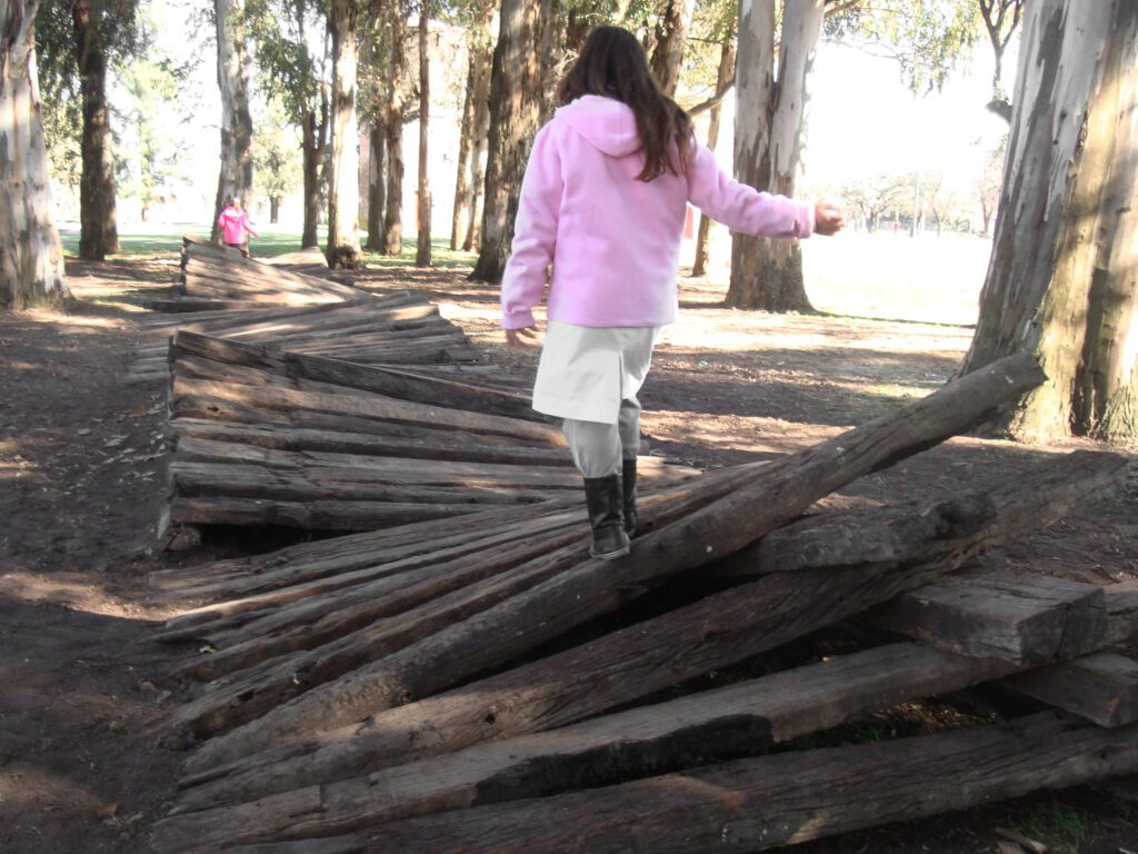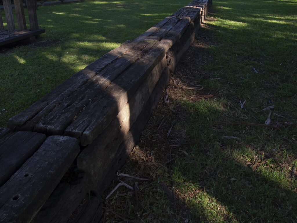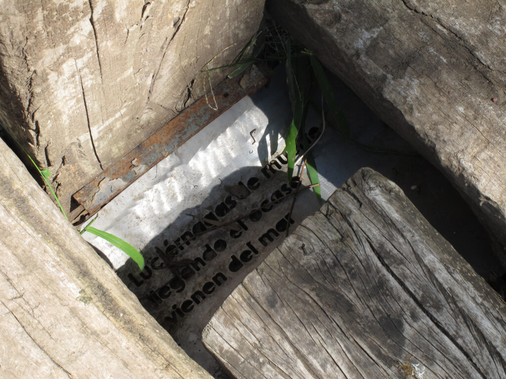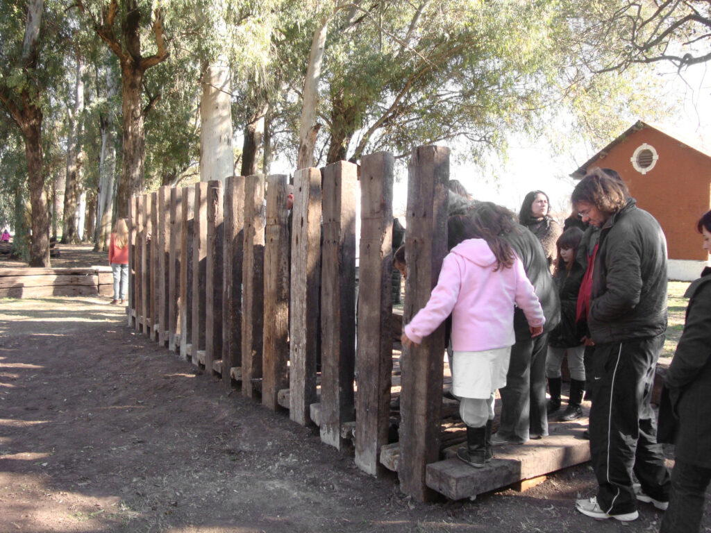 El proyecto transforma un sector de límites difusos del predio ferroviario en un espacio de esparcimiento, continuidad, memoria. Uno de estos fragmentos comienza a pocos metros de la ex estación de ferrocarril (hoy lugar del Ferro Club); el otro, es una plantación de eucaliptus característica de las estaciones de trenes. Ambos sitios se encontraban separados por un cerco. La intervención está compuesta por tres artefactos del paisaje construidos con durmientes de ferrocarril en desuso acopiados desde hace años dentro del predio, alineados sobre un eje paralelo a la avenida. El primero es una interpretación de quince poemas calados en placas de acero inoxidable del libro “Haikus de Guerra” escrito por Martín Raninqueo, músico y poeta, ex combatiente de Malvinas y bisnieto de caciques mapuches. El siguiente se articula sobre una estructura existente de hormigón de 30 metros de largo sobre la cual se sostenía un cerco que fue retirado. Y el último, conforma una superficie ondulada de 22 metros de largo por 2.70 metros de ancho dentro de la plantación de eucaliptus.