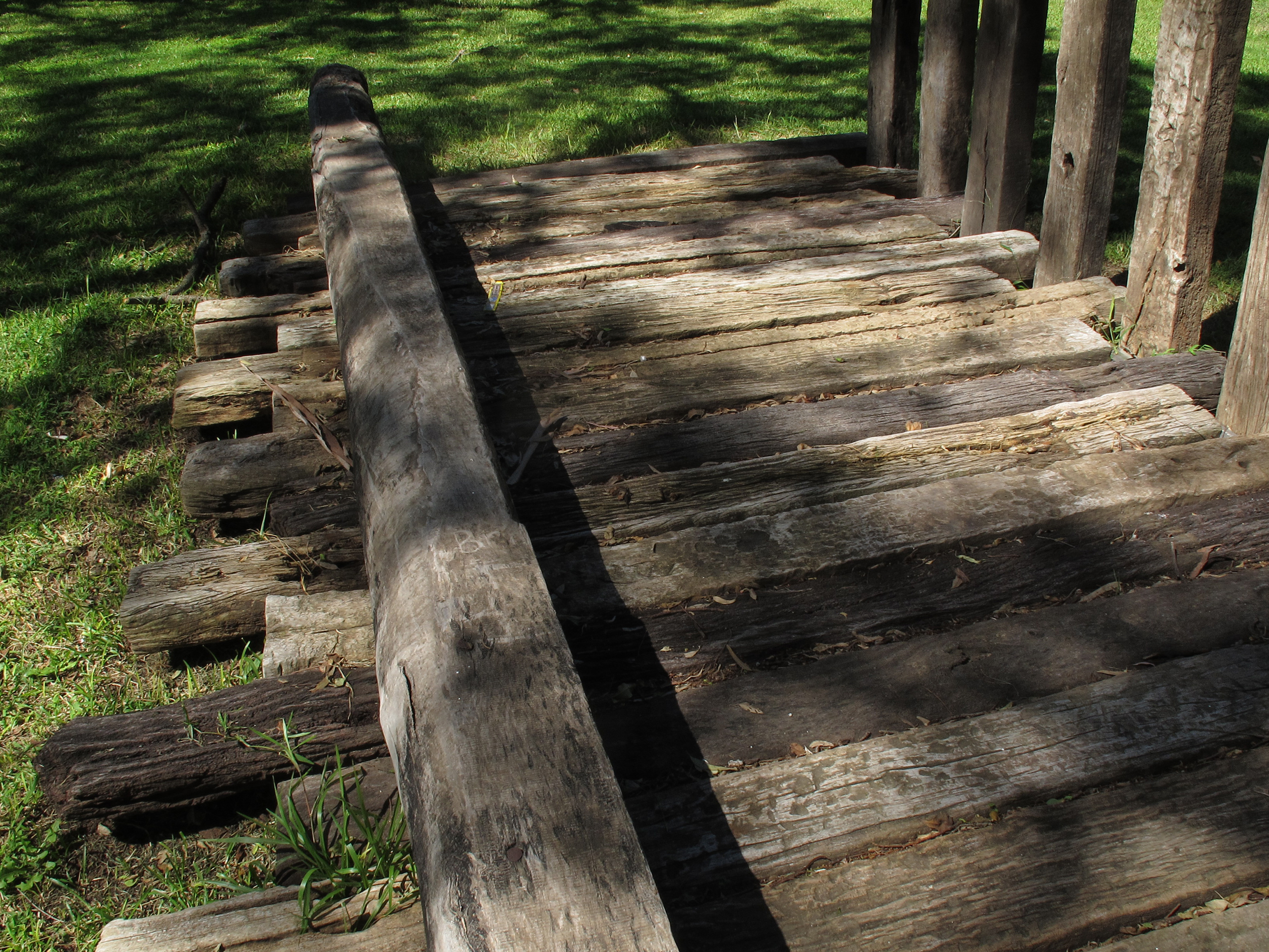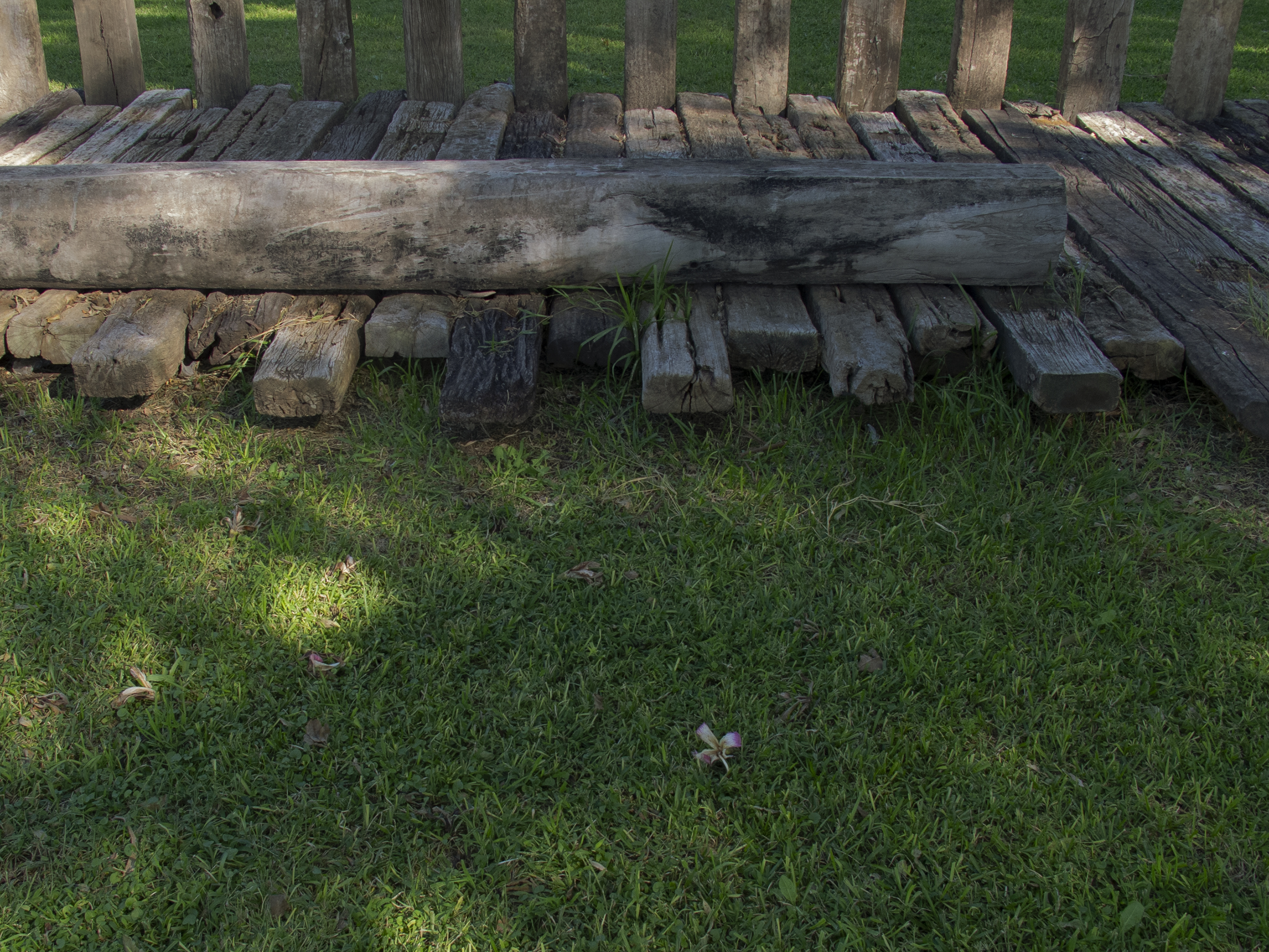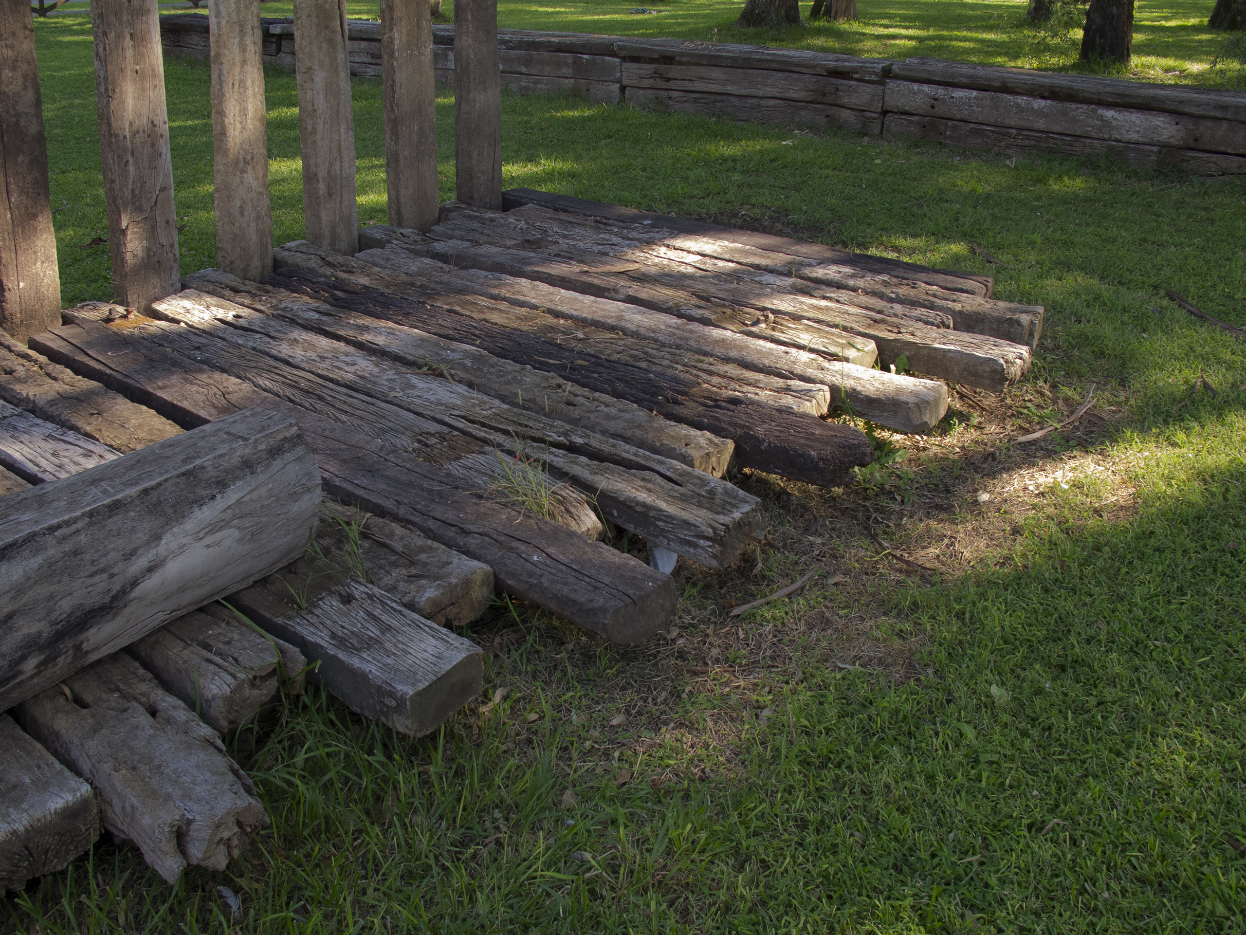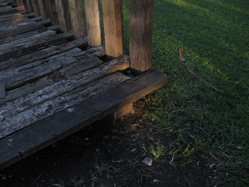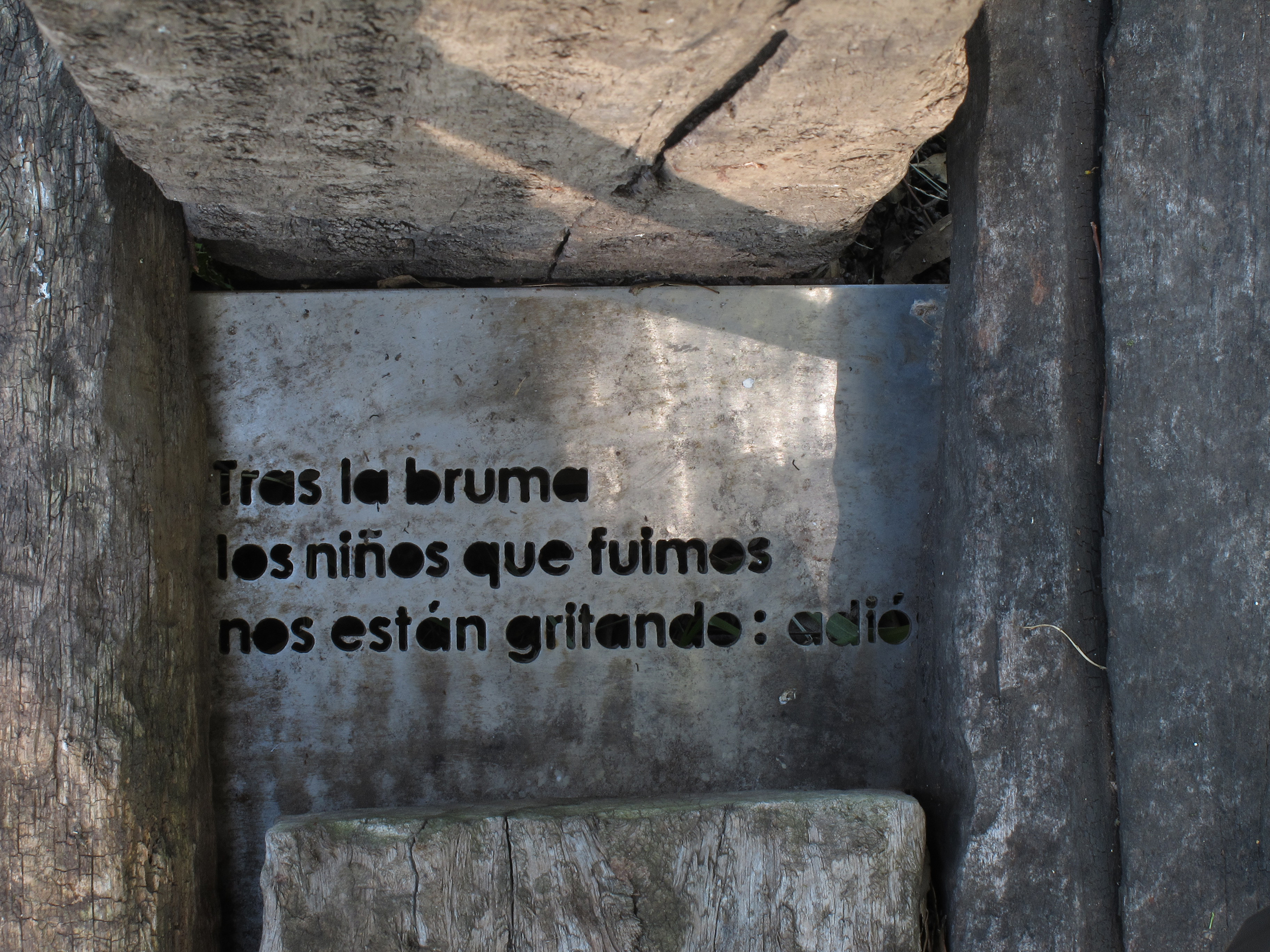 El proyecto transforma un sector de límites difusos del predio ferroviario en un espacio de esparcimiento, continuidad, memoria. Uno de estos fragmentos comienza a pocos metros de la ex estación de ferrocarril (hoy lugar del Ferro Club); el otro, es una plantación de eucaliptus característica de las estaciones de trenes. Ambos sitios se encontraban separados por un cerco. La intervención está compuesta por tres artefactos del paisaje construidos con durmientes de ferrocarril en desuso acopiados desde hace años dentro del predio, alineados sobre un eje paralelo a la avenida. El primero es una interpretación de quince poemas calados en placas de acero inoxidable del libro “Haikus de Guerra” escrito por Martín Raninqueo, músico y poeta, ex combatiente de Malvinas y bisnieto de caciques mapuches. El siguiente se articula sobre una estructura existente de hormigón de 30 metros de largo sobre la cual se sostenía un cerco que fue retirado. Y el último, conforma una superficie ondulada de 22 metros de largo por 2.70 metros de ancho dentro de la plantación de eucaliptus.